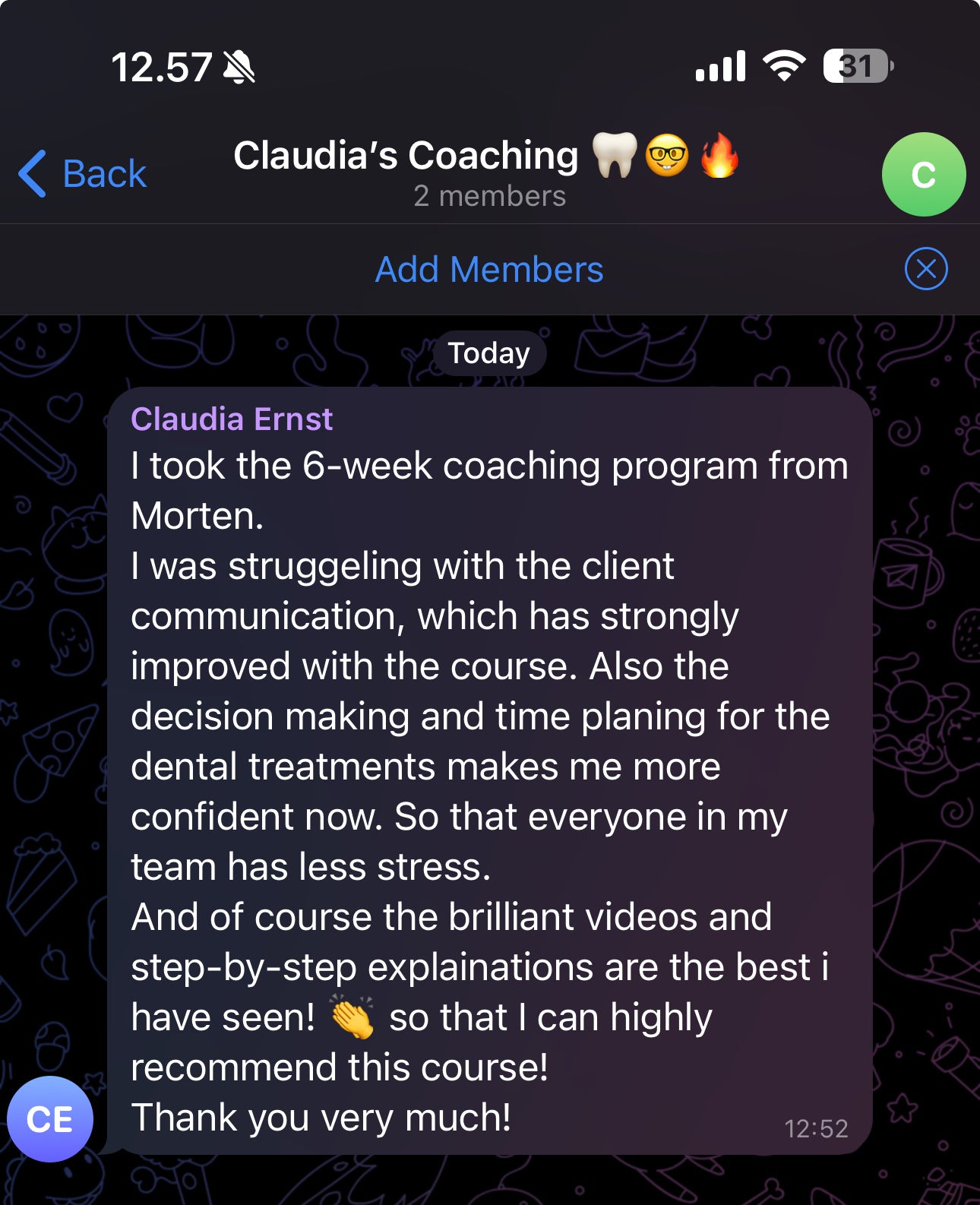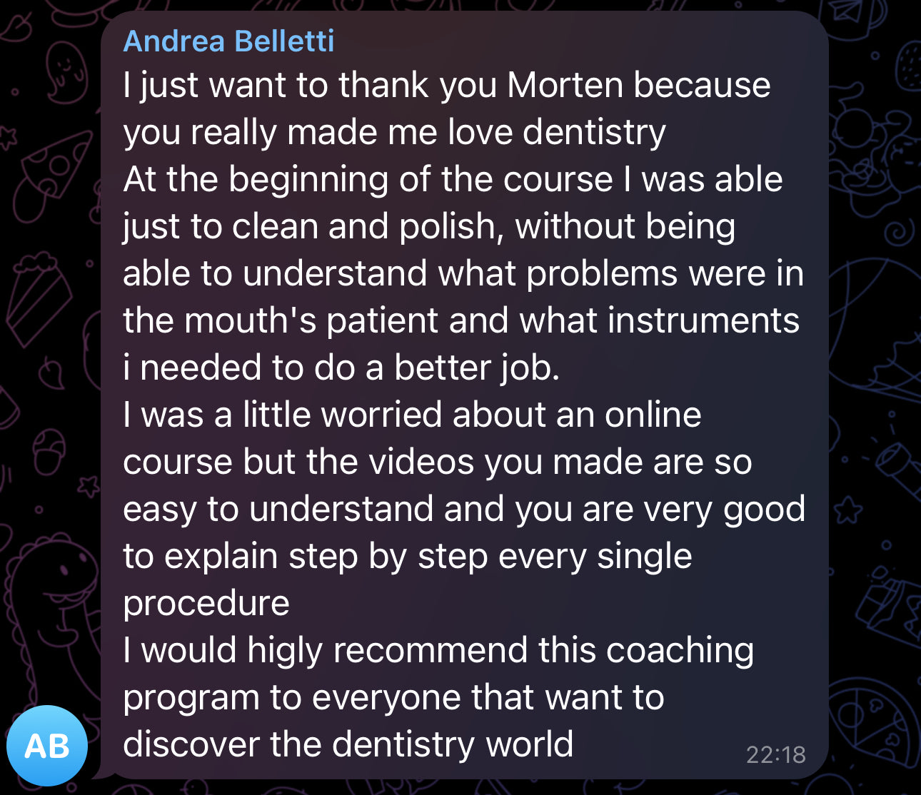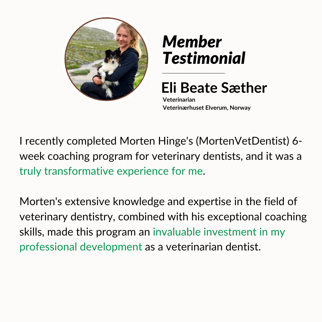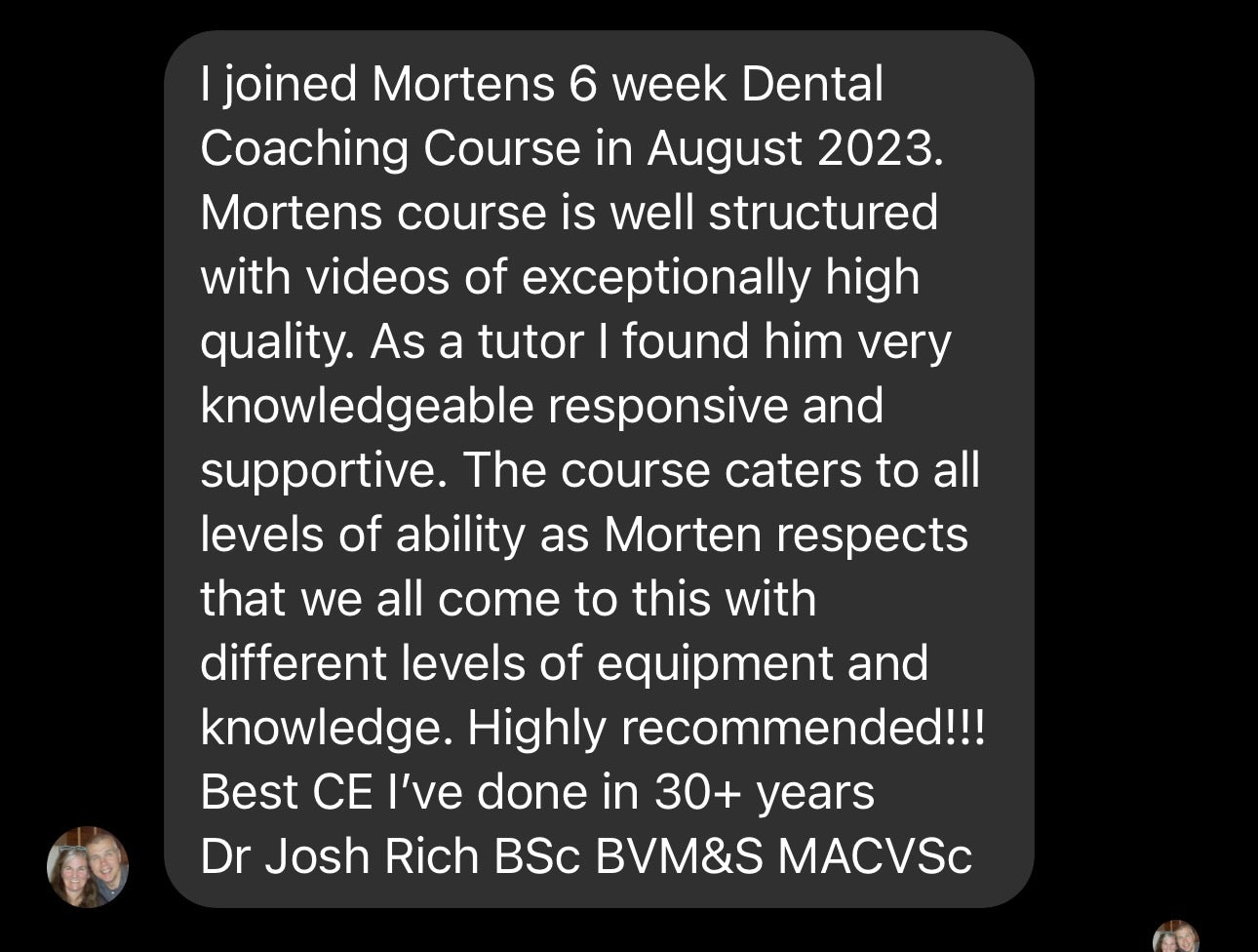 8 weeks of personalized coaching Direct access to me, your mentor, for tailored guidance to accelerate your learning.Immediate access to comprehensive video lessons to get a head start.Access to my dental community of vets to exchange ideas and ask questions. Join Live Q&A sessions every other weekInvestment: €4500*Option 2: Independent Learning + Video Course + Community Support