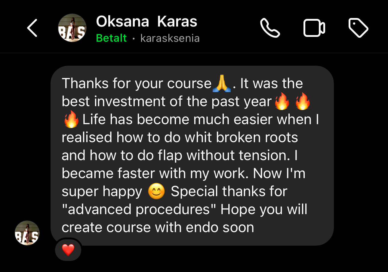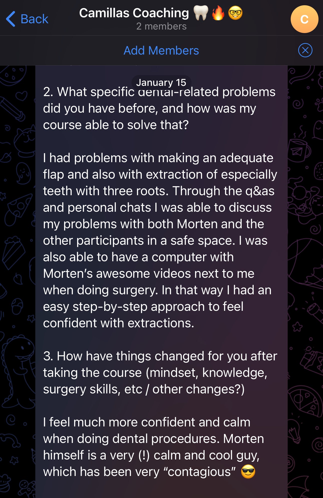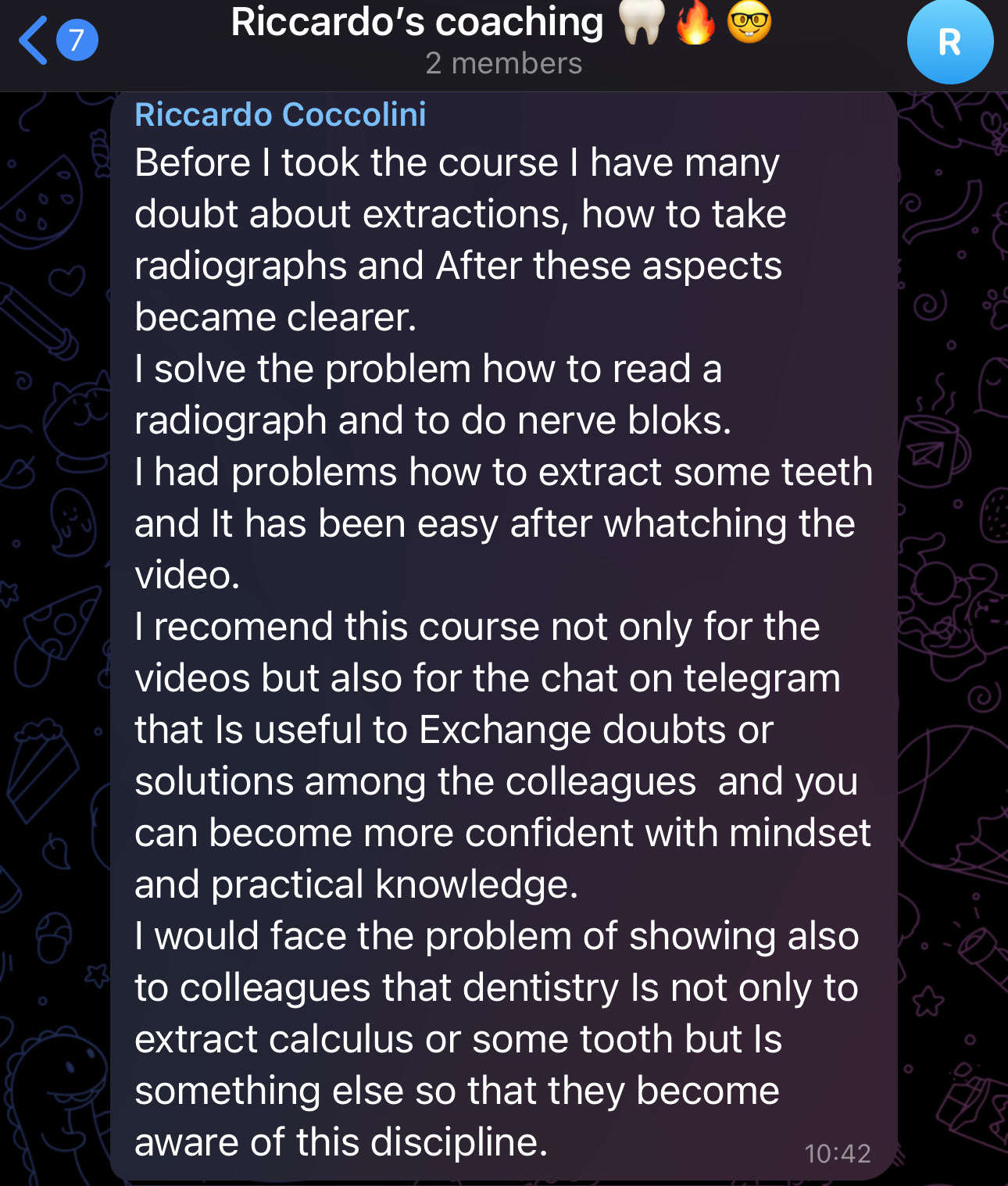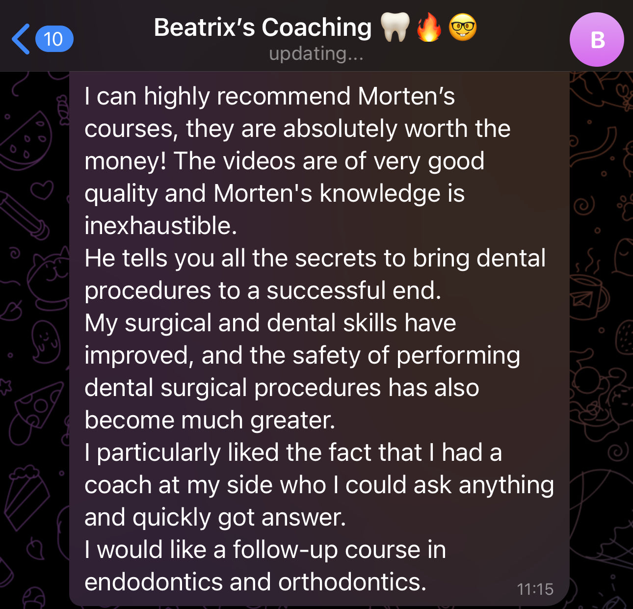 🔪 You will get access to Step-by-step narrated surgical videos recorded in high definition that you can watch before or during the surgery on your phone. So you will always know how to design your flap, how much bone to remove and how to get out the root tip if it fractures.